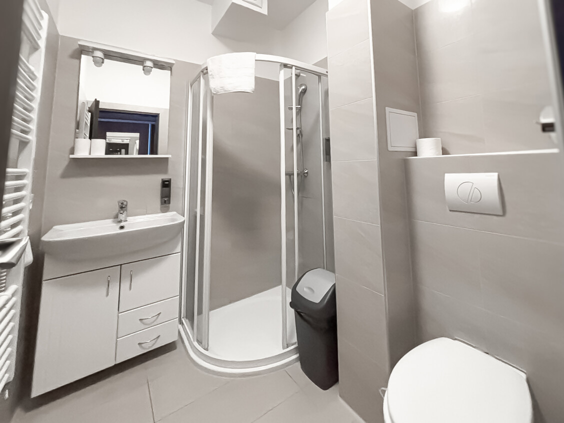 Pokoji dominuje pohodlná manželská postel pro dvě osoby. Na rozdíl od našich apartmánů tento pokoj nedisponuje kuchyňským koutem ani varnou konvicí, je však vybaven chladničkou, kterou využijete pro uchování nápojů či drobného občerstvení. Samozřejmostí je vlastní koupelna se sprchovým koutem a toaletou.